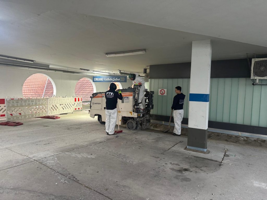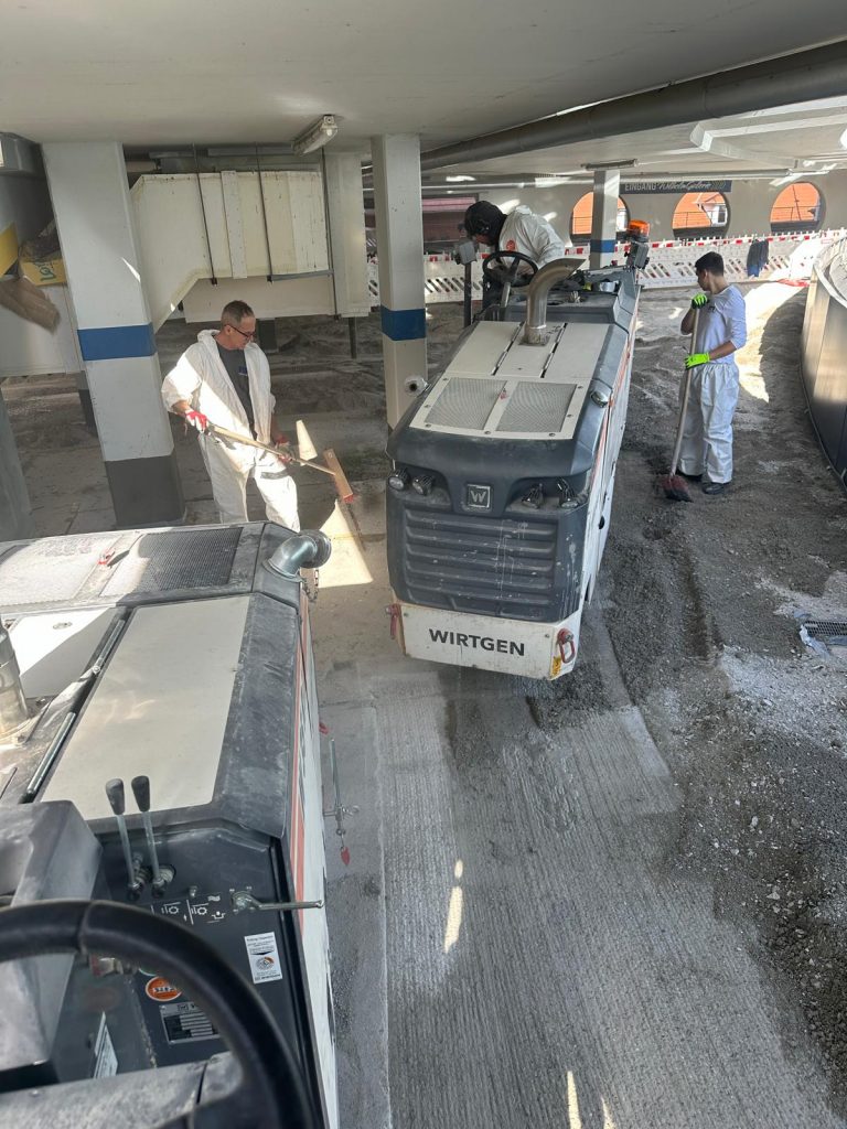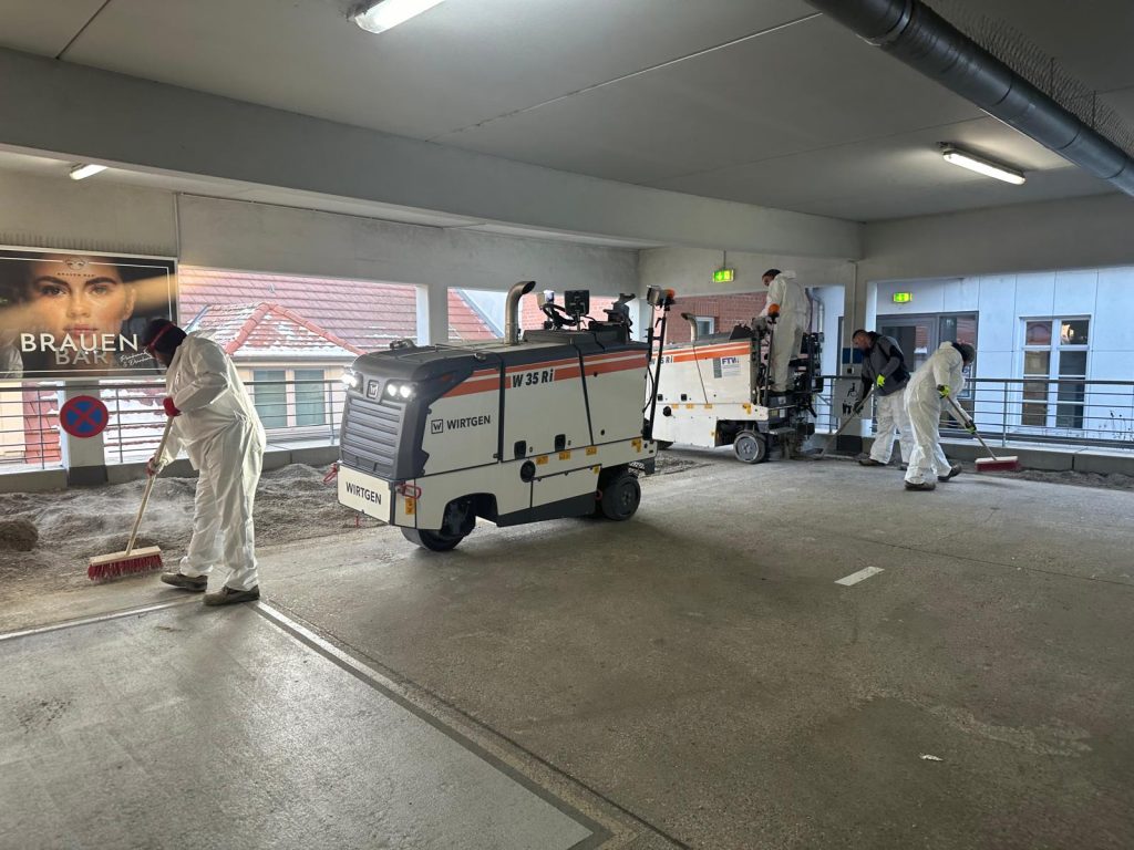 - Im Innenbereich arbeiten unsere Fräsen mit Staubsaugung. Die Aufnahme des Fräsguts erfolgt mit unserer Spezialkehrmaschine
